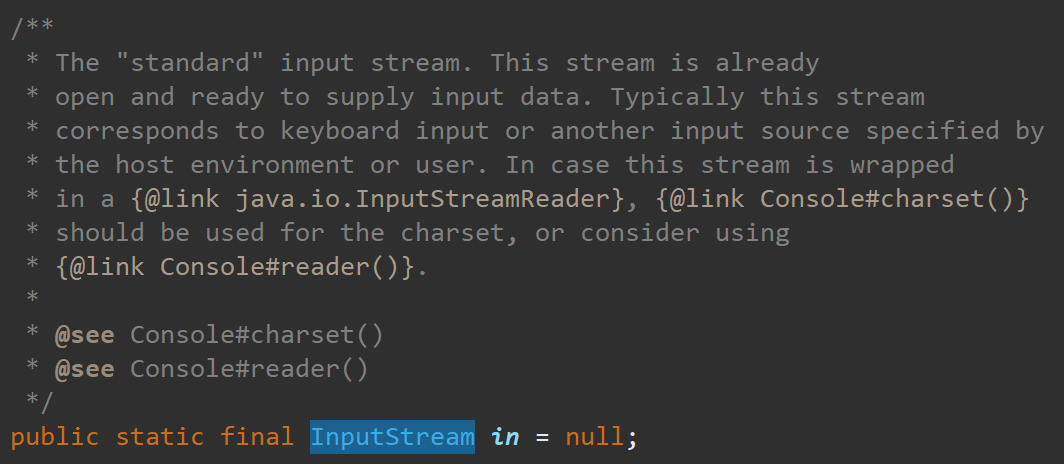 먼저 System 클래스는 자바에서 제공하는 유틸리티 클래스로 입출력 스트림이나 시스템 명령어 등의 기능을 제공합니다. 이 System 클래스에 in 필드는 InputStream 타입의 객체라고 정의되어있습니다.