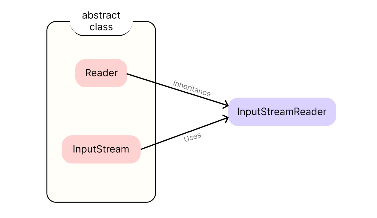 InputStreamReader는 Reader 추상 클래스를 상속 받고 있습니다. 그리고 위에서 System.in이라는 InputStream 타입의 필드를 인자로 전달 받는다고 했습니다. 아래는 이 관계를 나타낸 모습입니다.