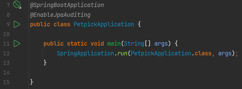 표준 라이브러리에는 @Target이 ElementType.TYPE으로 정의되어 있습니다. TYPE은 class, interface, enum에 사용할 수 있는 속성입니다. @EnableJpaAuditing은 @Target이 TYPE이기 때문에 메인 클래스(PetpickApplication)에 적용해줬습니다. 이렇게 메인 클래스에 @EnableJpaAuditing를 적용하면 Auditing 기능을 전역에서 사용할 수 있도록 AuditingEntityListener를 자동으로 등록합니다.