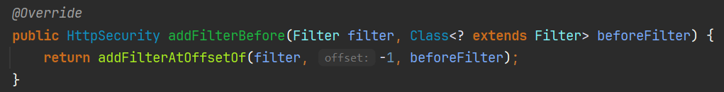 addFilterBefore 메서드에 커스텀 필터를 추가할 땐 메서드 이름에 걸맞게 이미 존재하는 UsernamePasswordAuthenticationFilter라는 필터 앞에 작성해야합니다. 아래의 사진은 addFilterBefore의 표준 라이브러리입니다.