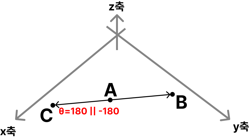 이미지 1에서 벡터 AB와 벡터 AC는 회전하지 않고 0도를 이루고 있습니다. 또한 이미지 2에서 벡터 AB와 벡터 AC는 180도 혹은 -180도 회전하여 일직선을 이루는 것을 볼 수 있습니다.
