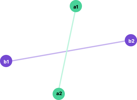 따라서 우린 하나의 선분을 기준으로 잡고 나머지 선분의 점에 외적을 했을 때 전부 부호가 서로 반대가 되어야 교차한다는 결론을 내릴 수 있습니다. 즉, 선분 a에 대해서 b1과 b2에 외적한 값을 서로 곱했을 때 음수가 나와야하고, 선분 b에 대해서 a1과 a2에 외적한 값을 서로 곱했을 때 음수가 나와야합니다.