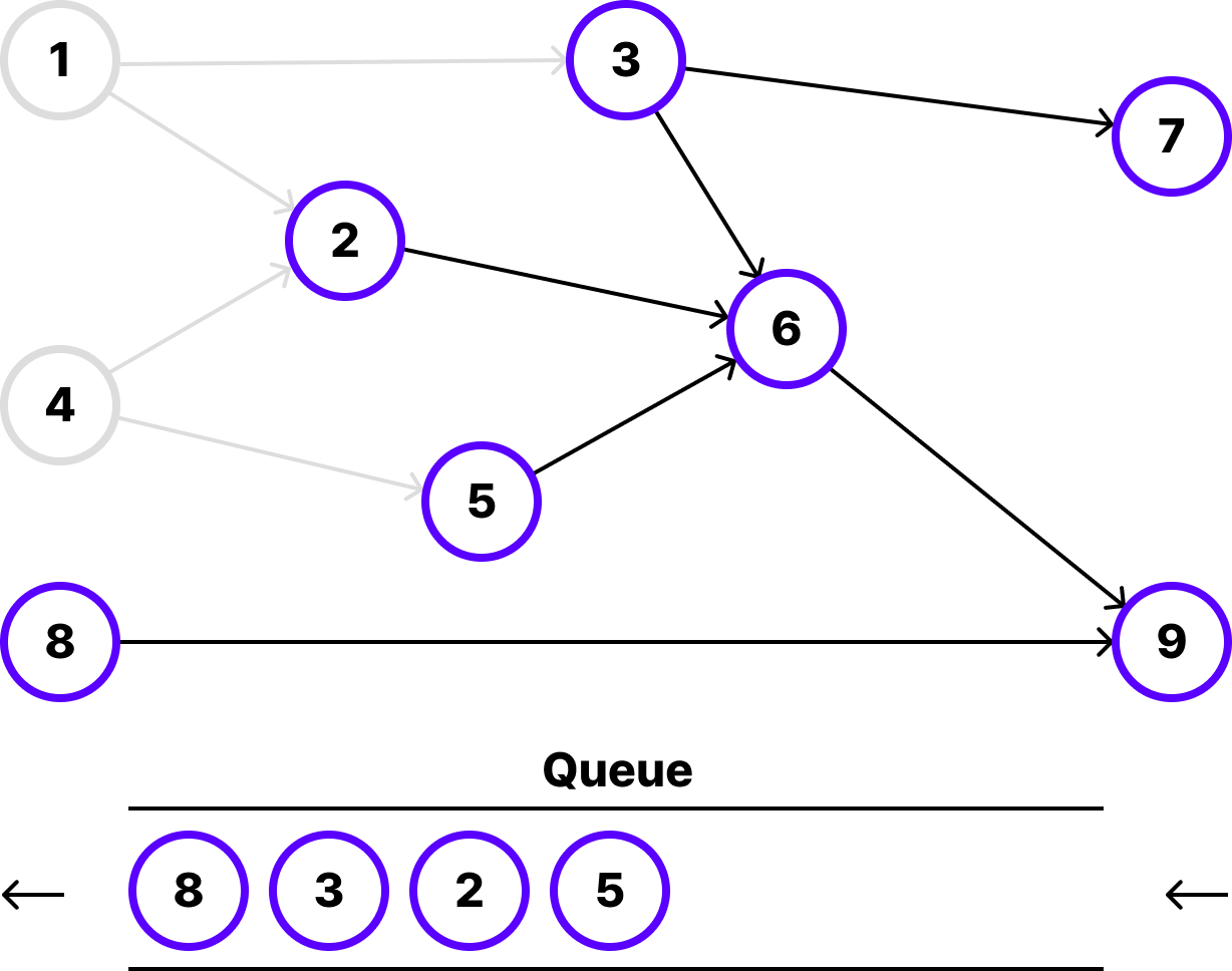 8번 노드와 인접한 9번 노드의 진입 차수를 1 줄이고, 9번 노드를 큐에 삽입합니다.