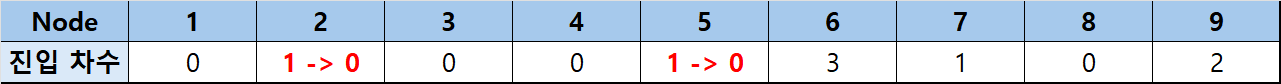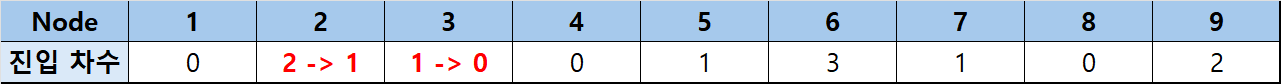 우선 1번부터 9번까지 각 노드에 진입 차수를 저장합니다.