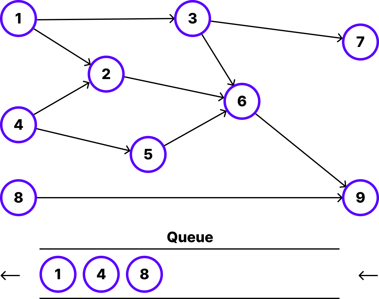 우선 최초에는 진입 차수 배열의 전체를 탐색하면서 큐에 진입 차수가 0인 노드들을 삽입합니다. 따라서 1, 4, 8번 노드를 큐에 삽입합니다. 큐에 진입 차수가 0인 노드를 삽입할 때 순서는 중요하지 않습니다.