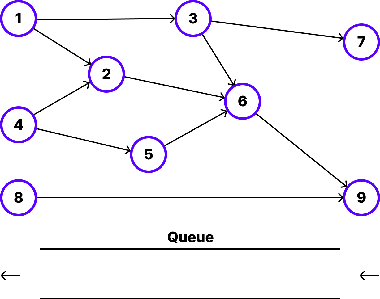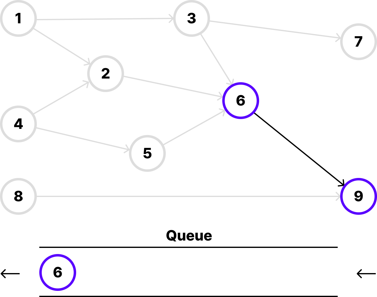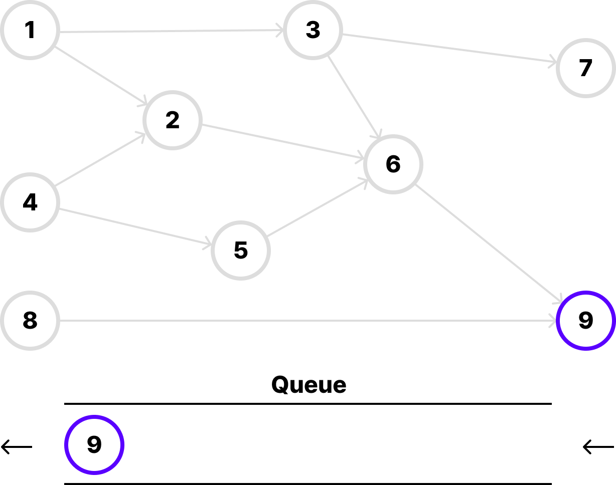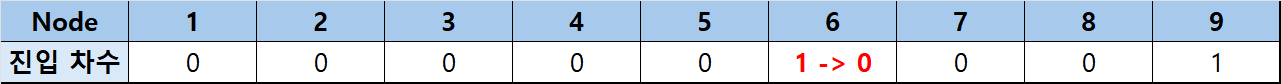 6번 노드를 추출하고 인접한 9번 노드의 진입 차수를 1 감소시킵니다. 그리고 9번 노드를 큐에 추가합니다.