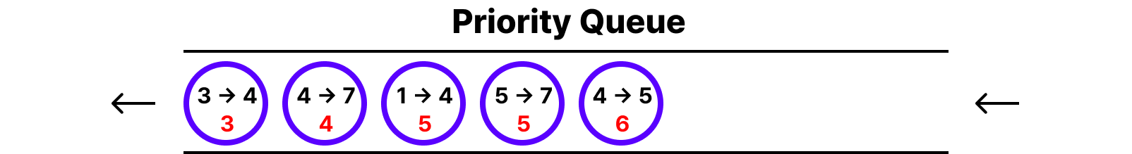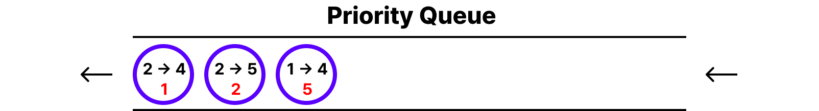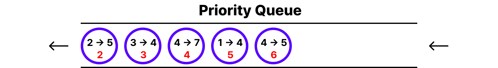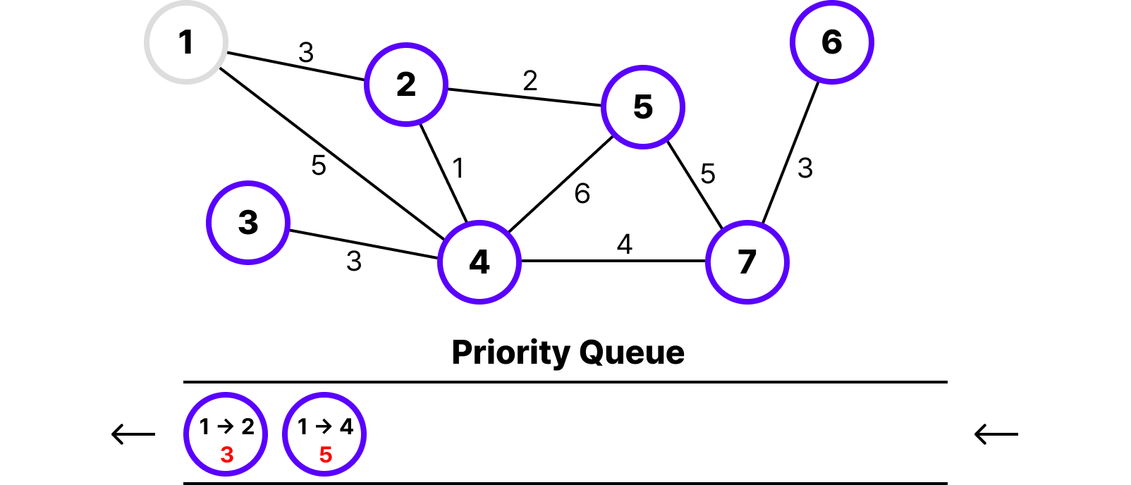 시작 노드인 1번 노드와 연결된 간선은 2개입니다. 이때, 가중치를 기준으로 오름차순으로 정렬되므로 위의 그림과 같이 우선순위 큐에 삽입됩니다.