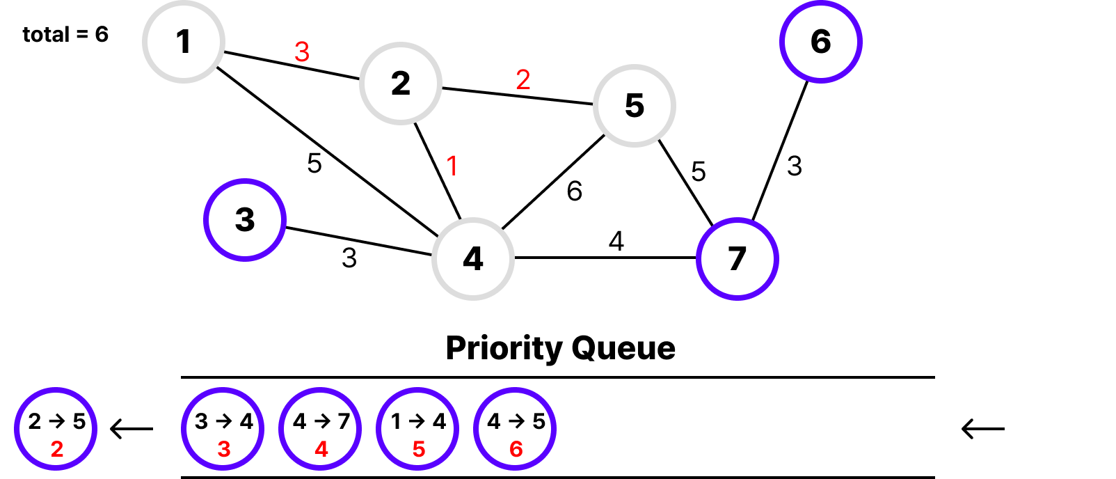 우선순위 큐에서 가중치가 가장 낮은 노드를 추출했습니다. 2번 노드에서 5번 노드로 향하는 간선이므로 total에 2를 더하면서 5번 노드를 방문 처리합니다.