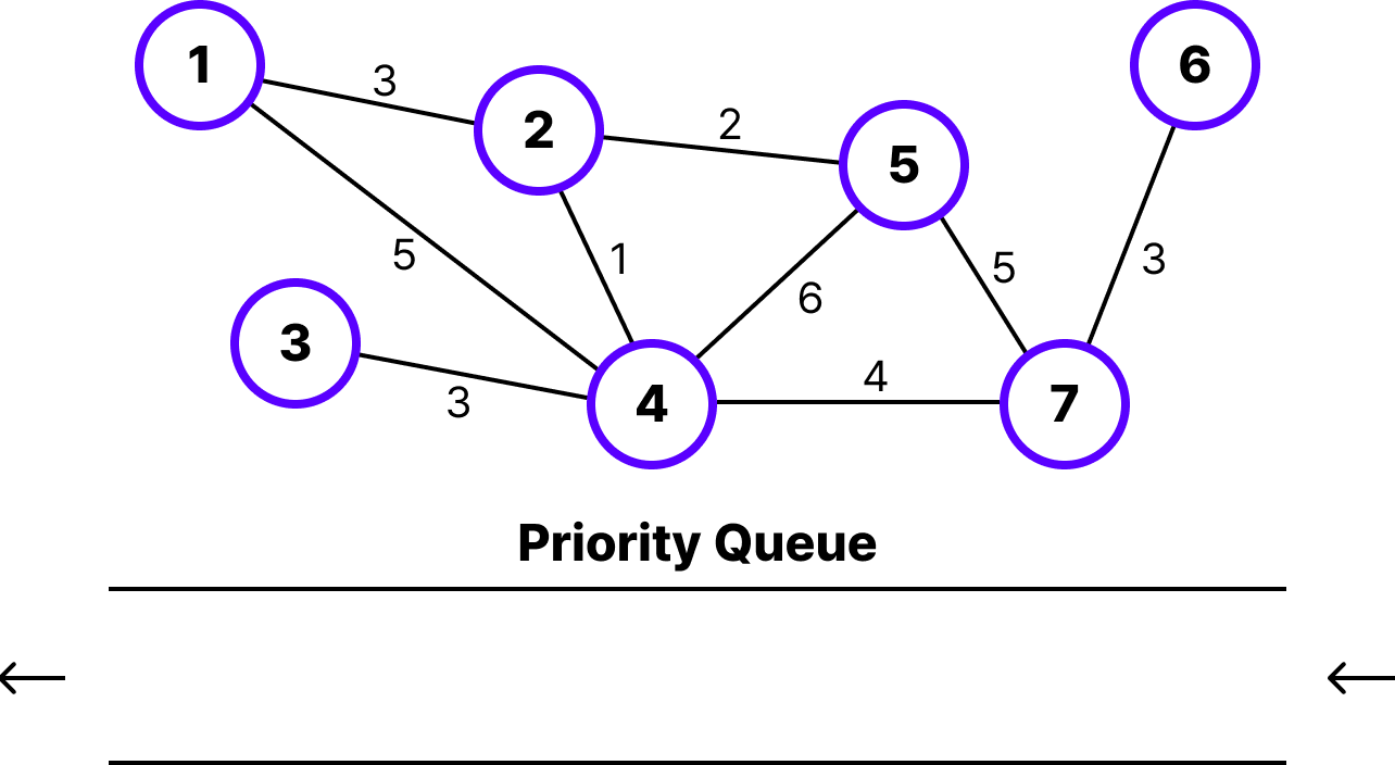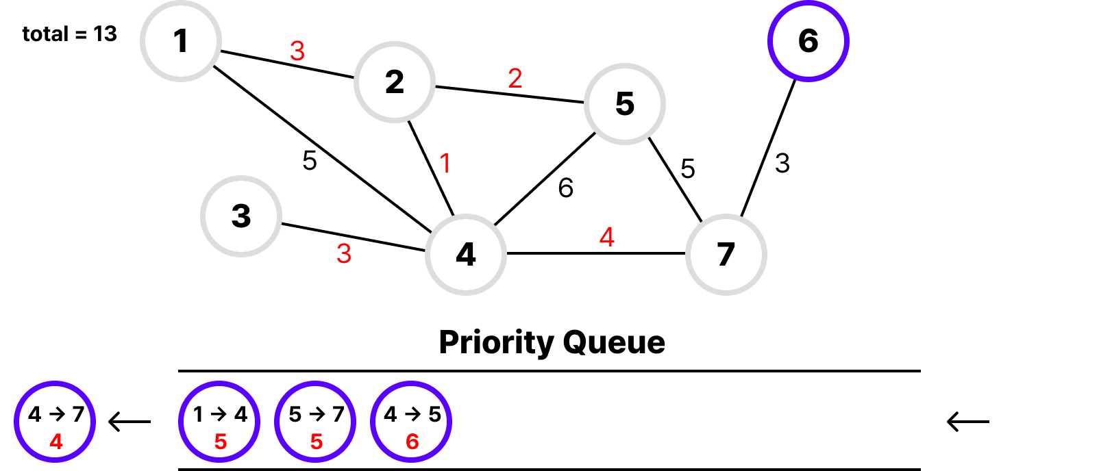 7번 노드와 인접한 노드 중 아직 신장 트리에 연결되지 않은 노드는 6번 노드밖에 없습니다. 삽입 후의 우선순위 큐는 아래와 같습니다.