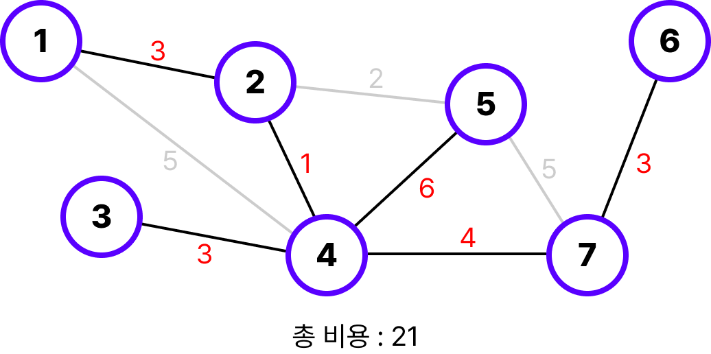 // 사용한 간선의 수가 n-1개가 되는 순간 MST 완성