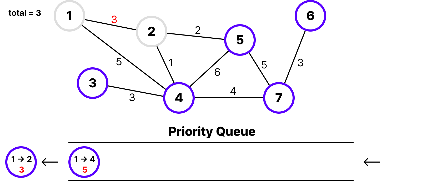 우선순위 큐에서 가중치가 가장 낮은 간선을 추출했습니다. 2번 노드는 아직 한 번도 방문하지 않았기 때문에 방문 처리하고, total 변수에 3을 더합니다.