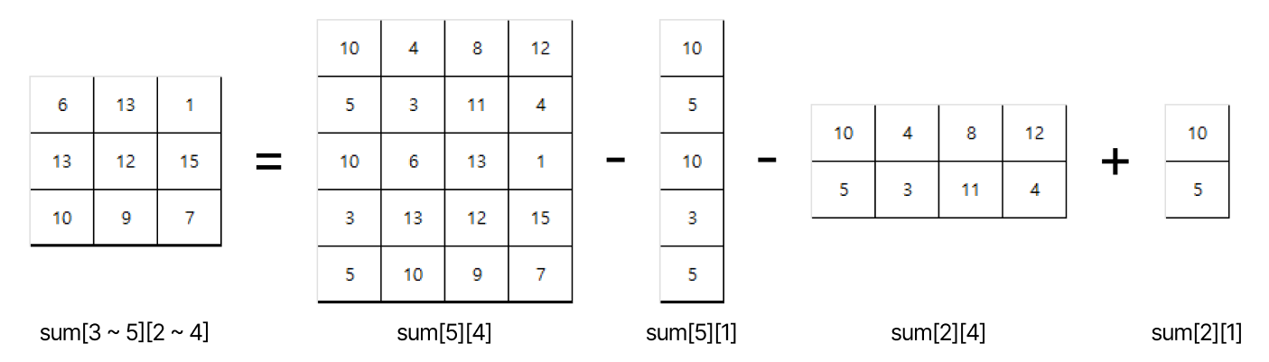 위의 그림을 수식으로 나타내면 $sum[3 to 5][2 to 4] = sum[5][4] - sum[5][1] - sum[2][4] + sum[2][1]$입니다. 말로 쉽게 설명하면 전체에서 짜투리를 잘라내고 두 번 잘라낸 짜투리는 다시 더해주는 방식입니다.