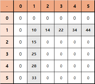 - 왼쪽 또는 위쪽 원소의 값이 0인 경우(1-based array의 2번째 행 또는 2번째 열)