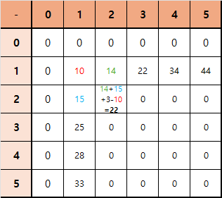$sum[1][2] = 10 + 4 = 14$