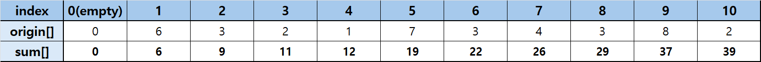 길이가 10인 int형 배열을 예시로 설명하겠습니다. 여기서 등장하는 origin 배열과 아래의 sum 배열은 1-based array입니다. 계산 편의를 위해 1번 인덱스부터 유효한 숫자를 저장했습니다.