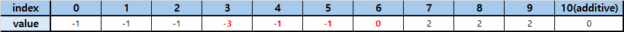 0번 인덱스에 -1를 하고, 마지막 인덱스의 다음 인덱스인 6번 인덱스에 +1을 합니다.