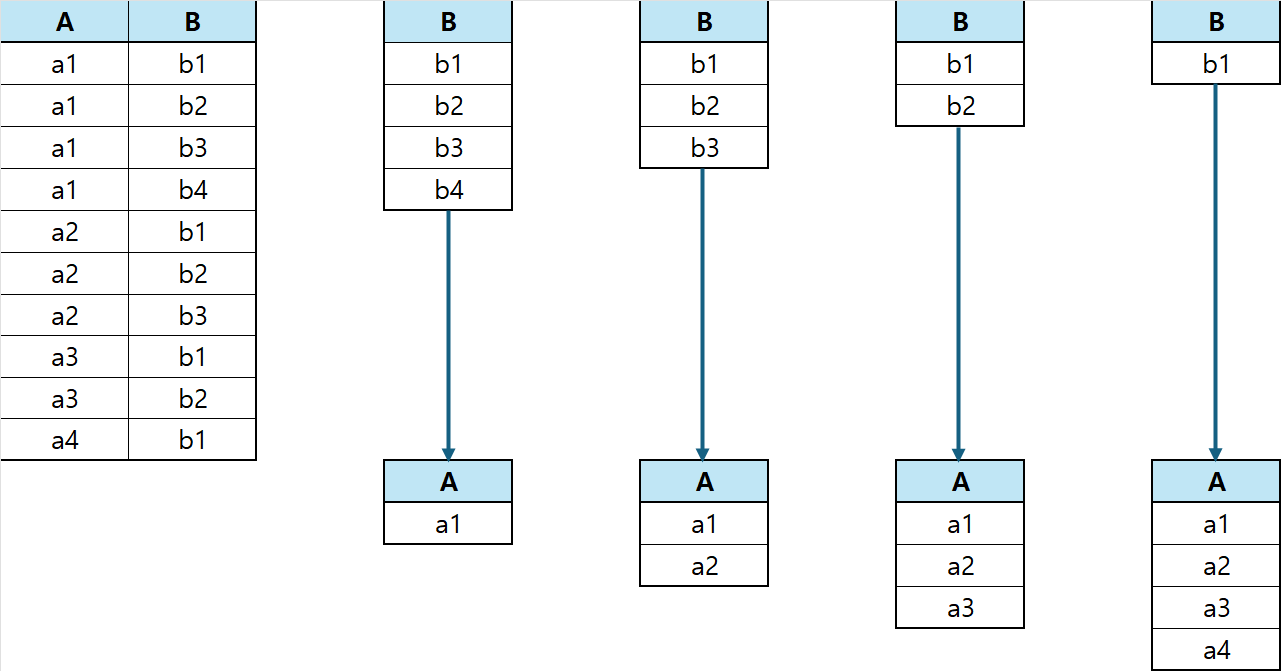 좌측 상단이 테이블1에 해당됩니다. 그리고 우측 상단의 4개의 테이블이 테이블2가 되고 테이블1을 나눕니다. 각 결과가 화살표로 연결되어있습니다.